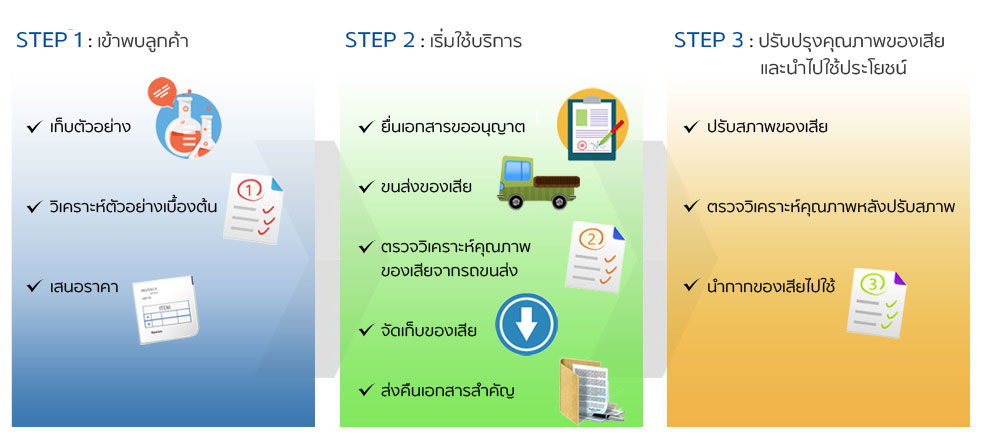 - กากอุตสาหกรรมประเภทของเหลวที่ให้ค่าความร้อน เช่น Used Oil, Solvent, IPA บริษัทฯ จะนำมาปรับสภาพเพื่อให้เหมาะสม และใช้ทดแทนเชื้อเพลิงหลัก